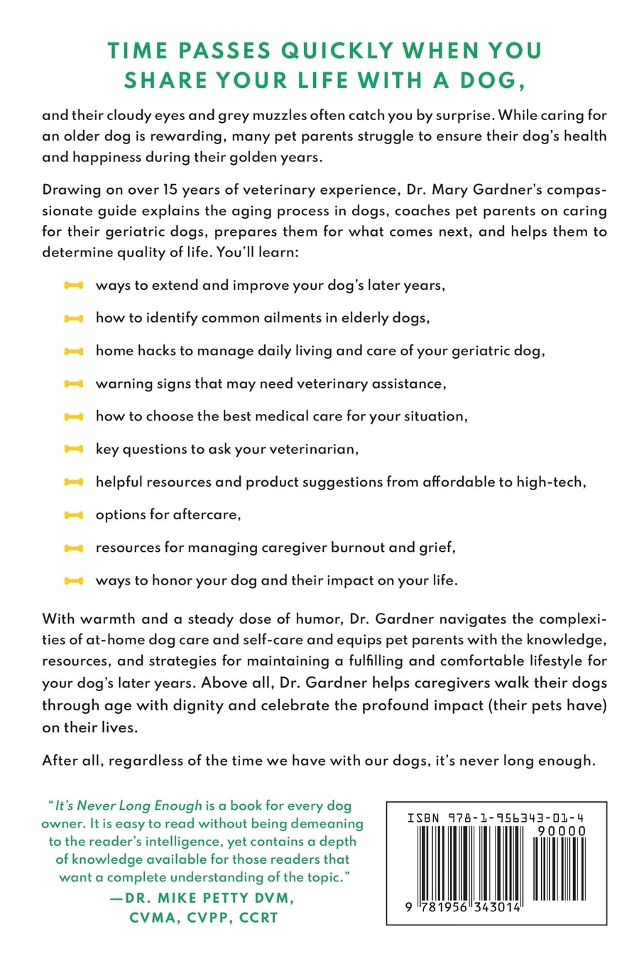 It’s Never Long Enough is highly recommended as a must-have practical and emotional resource for anyone caring for a senior or geriatric dog. Reviewers often state that the book provides the comfort and knowledge they needed to navigate this difficult time, making both the dog’s life and the owner’s caregiving easier and more meaningful.